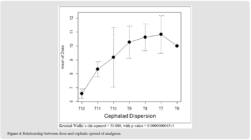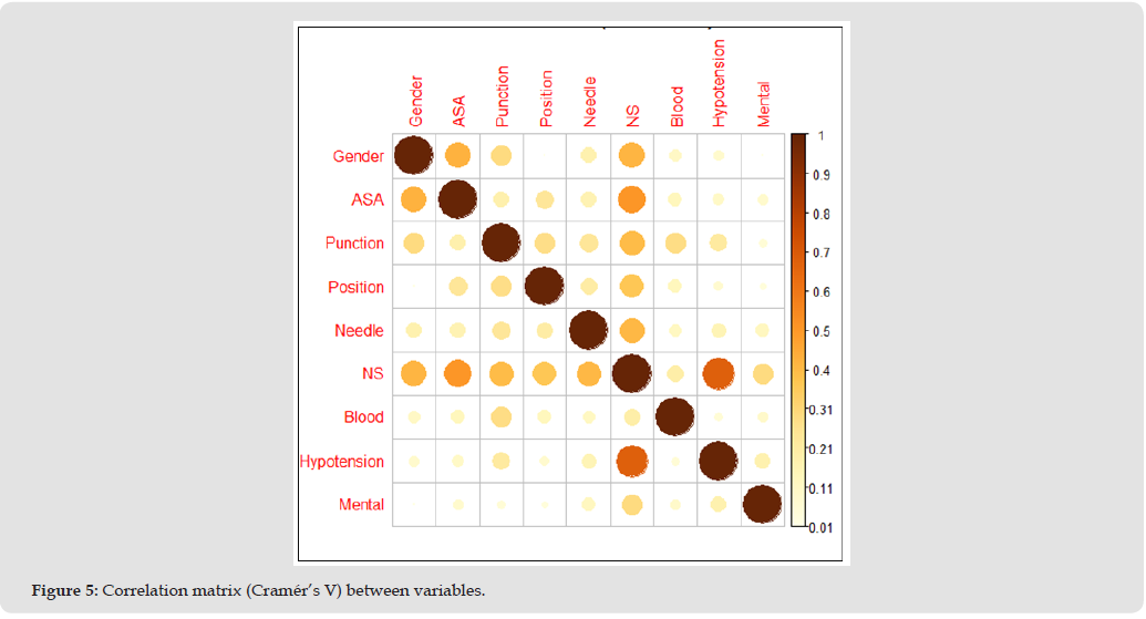 None of the 74 centenarian patients presented nausea and vomiting before, during or in the immediate postoperative period. All patients underwent spinal anesthesia in a sitting position and there was no need for supplementation with general anesthesia. The needles used were 25G Quincke 7 times, 26G Quincke in 25 times, 27G Quincke in 42 times, all without introducer. The average dose of 0.5% isobaric bupivacaine was 8.63 ± 2.03 mg, with the lowest dose being 6 mg and the highest dose being 15 mg (Figure 3). The cephalad dispersion varied between T12 and T6, in all patients. A very small p-value indicates that there is a statistically significant difference in the dose between cephalic dispersion of analgesia. Thus, the dose varies significantly across the different levels of analgesia (Figure 4). Fifty-nine patients (80%) had grade 3 motor block, and 15 (20%) patients had grade 2 motor block of the limbs. All patients received 500 mL of 6% hydroxyethyl starch in 0.9% sodium chloride and the average dose of lactated Ringer’s was 1,188 ml. Arterial hypotension occurred in 3 (4%) patients and was easily treated with only one dose of ethilephryne. Bradycardia was not observed in any patient. Correlation matrix (Cramér’s V) between variables (Figure 5) Patients’ analgesia was performed with a lumbar plexus block. Before surgery, 54 neurostimulator blocks were performed inguinal and 20 after the end of surgery (7 inguinal and 13 psoas), with a mean duration of analgesia in the 74 centenarian patients was 22.02 ± 3.30 hours.