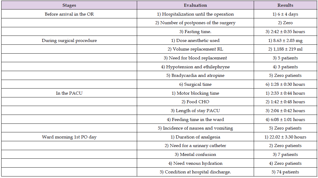 No patient required the use of a urinary catheter in the post-operative time, and no patient used a surgical drain as part of the conduct established with the implementation of the acceleration project. After discharge from PACU, the patient was transferred to the ward without intravenous hydration, none of the patients required hydration due to a drop in blood pressure and accepted oral feeding very well. All 73 patients transferred from PACU directly to the ward and were ready for hospital discharge on the first postoperative day. Only the 112-year-old patient was referred to the ICU as he was the 2nd oldest patient undergoing surgery and anesthesia in the world. Hospital discharge for residency dependent on the CHM Social Service. There was only one death at home in the first month after surgery