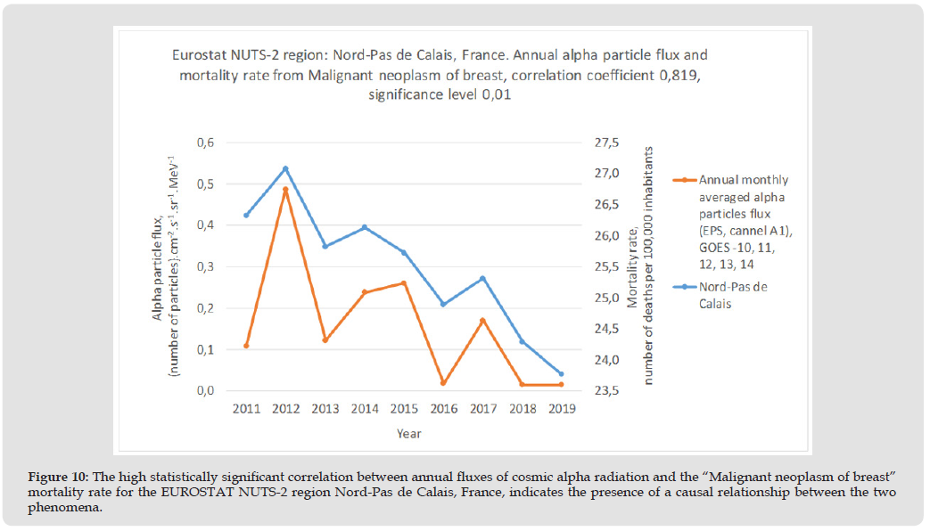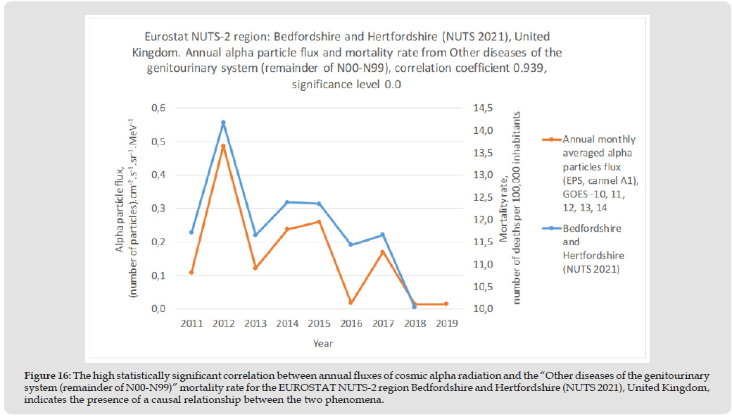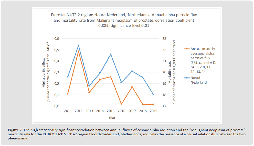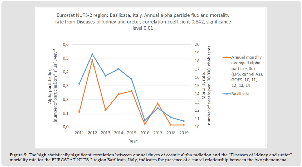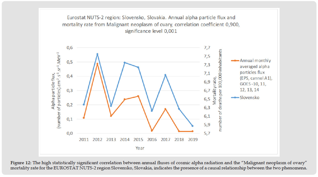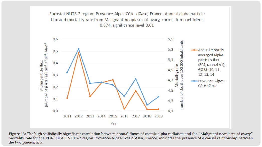 The high correlation between the two numerical sequences can be seen, indicating a causal relationship between them. Figure 6 shows the distribution of the mortality rate for the EUROSTAT shortlist death cause „ Malignant neoplasm of prostate” for Europe and the Mediterranean for the studied interval. The statistically significant influence of alpha radiation on mortality from “Malignant neoplasm of prostate” is limited to separate areas covering the Nordic countries Sweden, Estonia, and Denmark, as well as small areas of Central France and Spain. For Southern Sweden, the 2012 mortality peaks and their correlation with annual solar alpha fluxes coincide, indicating that high-energy solar alpha fluxes are causally related to mortality in the region from the mentioned disease. An example of a high correlation between solar alpha radiation annual flux and mortality from “Malignant neoplasm of prostate” is shown in Figure 7. Figure 8 shows the distribution of the mortality rate for the EUROSTAT shortlist death cause „Malignant neoplasm of breast” for Europe and the Mediterranean for the studied interval. The statistically significant influence of alpha radiation on mortality from “Malignant neoplasm of breast” is limited to separate areas covering Nortern France, Nortern Italy, and Nortern Germany. The 2012 mortality peaks and correlation maximums between annual mortality and annual solar alpha fluxes coincide, indicating that high-energy solar alpha fluxes are causally related to mortality from the mentioned disease in the specified regions. Examples of a high correlation between solar alpha radiation annual flux and mortality from “Malignant neoplasm of breast” are shown in Figures 9 and 10. Figure 11 shows the distribution of the mortality rate for the EUROSTAT shortlist death cause „Malignant neoplasm of ovary” for Europe and the Mediterranean for the studied interval. The statistically significant influence of alpha radiation on mortality from “Malignant neoplasm of ovary” is limited to separate areas covering Nortern France, Nortern Italy, and Nortern Germany. The 2012 mortality peaks for Lithuania, Western UK, and Eastern Bulgaria and correlation maximums between annual mortality with annual solar alpha fluxes coincide, indicating that high-energy solar alpha fluxes are causally related to mortality from the mentioned disease in the specified regions. Examples of a high correlation between solar alpha radiation annual flux and mortality from “Malignant neoplasm of ovary”, are shown in Figures 12 & 13. Examples of a high correlation between solar alpha radiation annual flux and the mortality rate from “Malignant neoplasm of cervix uteri”, “Malignant neoplasm of other parts of uterus”, “Other diseases of the genitourinary system (remainder of N00-N99)”, and “Malignant neoplasm of bladder”, are shown respectively in Figures 14-17.