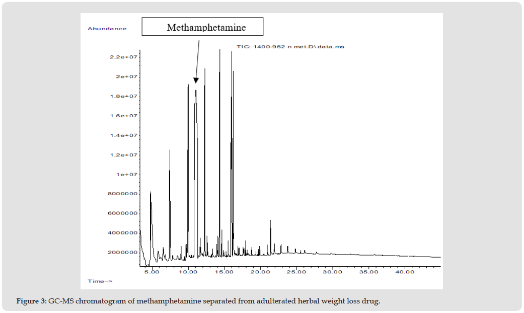 The global market for weight loss supplements has witnessed exponential growth, fueled by increasing health consciousness and the desire to achieve optimal body weight [1-6]. Research conducted among regularly exercising Turkish women revealed that 44.8% of participants used herbal dietary interventions for weight loss, with green tea being the most commonly used supplement [7]. In Central Mexico, a high prevalence of 45.2% was reported for the concomitant use of herbal products for weight loss and allopathic medicine, leading to adverse reactions and affecting medication adherence [8]. Among the myriad of weight loss products available, herbal supplements have gained popularity due to their perceived natural origins and minimal side effects [9-15]. However, a disturbing trend has emerged one that threatens both consumer safety and the credibility of the dietary supplement industry [16-19]. The counterfeiting of herbal weight loss supplements with undisclosed pharmaceuticals is a troubling matter that, numerous studies have underscored the detection of compounds such as sibutramine, fluoxetine, and ephedrine in these products [20-23]. The presence of undeclared substances in herbal supplements presents significant health hazards, underscoring the necessity for rigorous quality control and regulatory supervision in the production and sale of these products to safeguard consumer health [24]. Methamphetamine, an illicit substance, is a potent psychostimulant derived from amphetamine, leading to considerable somatic, psychiatric, and cognitive complications [25]. Chronic use of methamphetamine may lead to impaired cognitive functions, compromised decision-making, and diminished psychomotor abilities, which can result in delusions and psychotic [26,27].