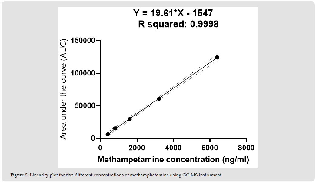 According to my previous publications, the GC/MS method for the detection of many drugs has been pre-validated in the forensic laboratory [2,22]. Sample preparation and instrumental conditions were standardized as a general approach to the detection of drugs with natural, acidic, and basic properties. The linearity of the method was evaluated by plotting a calibration curve for sibutramine. The resulting graph showed the peak area of the analyte over five different concentrations, each tested in triplicate. Regression analysis was applied to the data, which fit the equation y = ax + b. The sensitivity of the method was assessed by determining the limit of detection (LOD) and limit of quantification (LOQ) based on the standard deviation (SD) of ten injections at a low concentration of sibutramine (see Table 1). Methamphetamine was used as the internal standard for quantitative analysis. Calibration was performed using five-point calibrators, each measured in triplicate at concentrations of 400, 800, 1600, 3200, and 6400 ng/ml. The regression line, plotted using the method of least squares, gave a correlation coefficient (R^2 = 0.9990) indicating the relationship between the area under the curve (AUC) and the concentration of sibutramine.