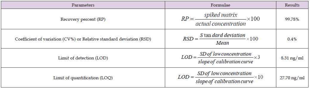 The current study revealed the presence of undeclared methamphetamine in herbal supplements, identified using liquid-liquid extraction (LLE) and gas chromatography-mass spectrometry (GC-MS). The examined sachet of herbal supplements bore the manufacturer’s name (ALPHA ALIM), with a production date of January 2020 and an expiration date of January 2023. However, it lacked a product number and batch number. The ingredient list included Asphatlu 40 mg, Vidanga 25 mg, Piper kourroa 30 mg, Garainiya 45 mg, Caffeine 75 mg, and Green Caffeine 35 mg. Methamphetamine was not listed on the label. The red capsules emitted an herbal scent, were white, labeled ALPHA SLIM, and had an average weight of 245.021 ± 0.312 mg (mean ± SD), as depicted in (Figures 1 & 2). Quantitative analysis revealed that all samples contained methamphetamine. The compound’s presence was confirmed through matching retention times (11.08 min) and spectra (base peak at 58.1 m/z) with standard references. For definitive identification, ion ratios of the unknown samples were compared with those of the standards. The capsules were quantitatively analyzed, indicating a methamphetamine concentration of 12122 ± 100.807 μg/Capsules. (Refer to Figures 3 & 4, and Table 1). The results of the method validation are presented in Table 2 and Figure 5.