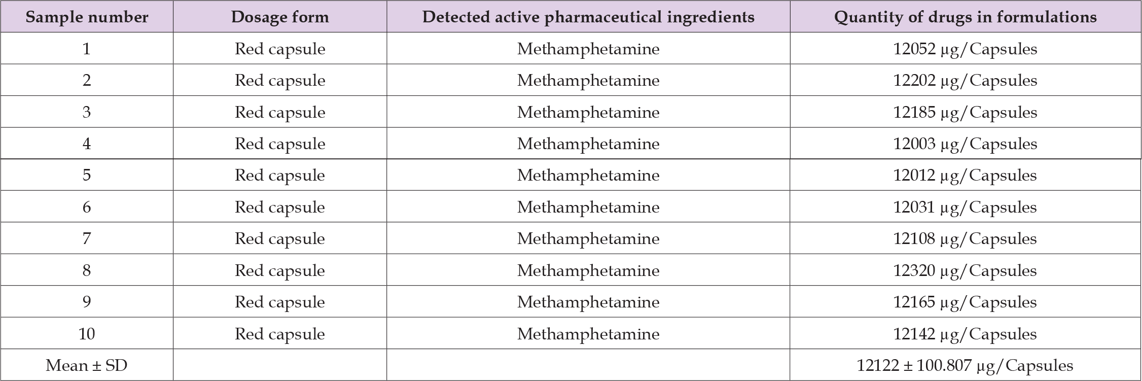 listed as an ingredient, with a methamphetamine concentration of 12122 ± 100.807 μg/capsule.