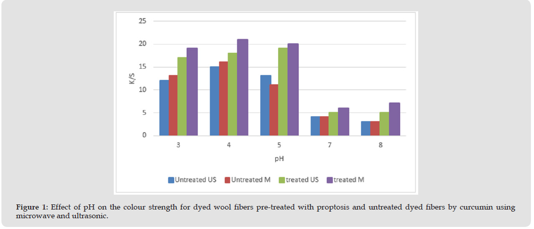The dye bath pH had an impact on the color strength of wool fibers colored with the natural dye under investigation. According to Figure 1, the dye used to dye the wool fibers produced the highest color strength (K/S) value at pH 5 for the ultrasonic method and pH 4 for the microwave technique.