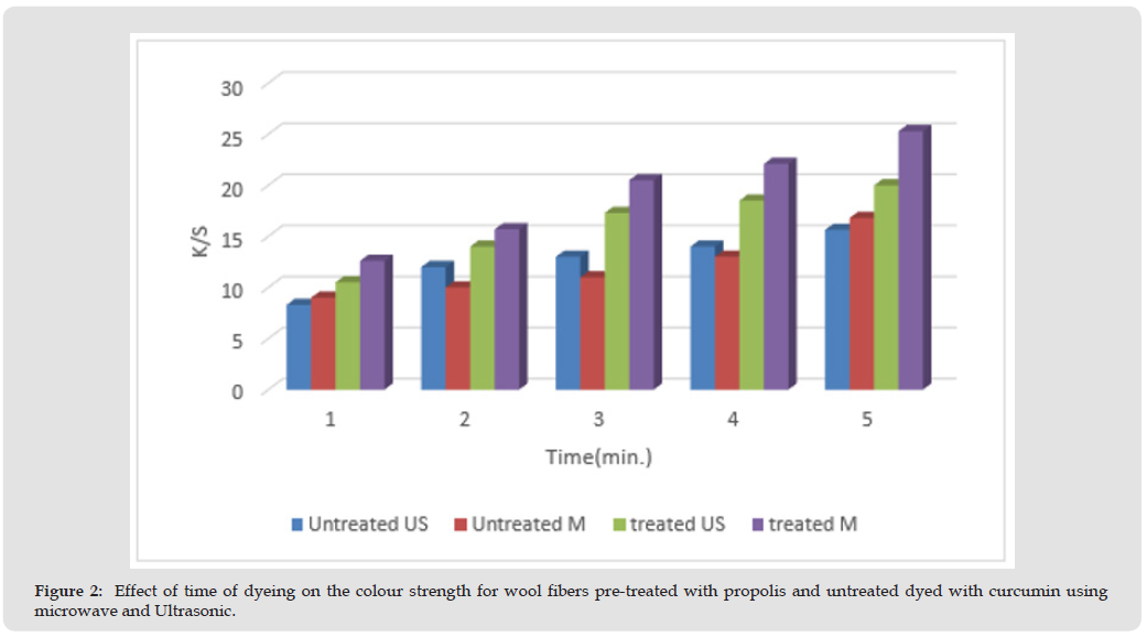 Microwave Dyeing of Wool Fibres: Wool fibres were microwave- -heated at varying pH values (3-9) for varying periods (1-5 minutes) in a dye bath with varying quantities of dye and a liquor ratio of 30:1. Following a 30-minute soak in a 60:1 liquor ratio and 3 g/L non-ionic detergent (Hosta pal CV, Clariant), the dyed samples were rinsed with cold water, dried at room temperature and then rinsed again. Dyeing, Wool Fibres Using an Ultrasonic Technique: Wool fibres were coloured at pH 5 and L.R. 1:50 using 2g of curcumin rushing ultrasonic dye. The samples were immersed in a bath containing 5g/l non-ionic detergent and dyed for 30 minutes at 500C using an ultrasonic power of 500watts. After the dyeing process, the samples were rinsed with cold water. dried at room temperature.