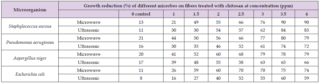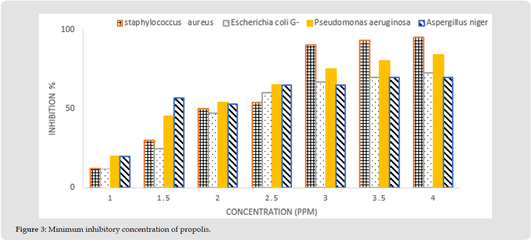 Pathogenic bacterial isolates, Staphylococcus aureus, Pseudomonas aeruginosa, Escherichia coli, together with one pathogenic fungal isolate, Aspergillus niger, were utilized to assess the antibacterial efficacy of wool fibers dyed with curcumin and pretreated with propolis [10]. It is evident from the results in the tables that the concentration of propolis affects the antibacterial activity of wool fibers. The antimicrobial activity of different strains of bacteria and fungi varies, and as the concentration of propolis increases, so does the rate of bacterial decrease. The type of bacteria and fungi determines how much these increase [11,12]. Numerous researchers have documented the antibacterial action of certain natural colors when combined with propolis treatment against pathogenic bacteria and fungus. The prepared sample fabrics exhibit higher antibacterial activity against Gram-positive (S aureus) bacteria than against Gram-negative (E coli) bacteria. The outcomes demonstrate that treated fibers have more antibacterial activity than untreated fibers. The antibacterial activity of wool colored using the microwave and ultrasonic methods differs slightly [13]. The antimicrobial properties of wool fibers treated with natural dye and propolis were found to be more efficient against pathogenic fungus like Aspergillus niger and Staphylococcus aureus G+ than Escherichia coli G- [14-21] (Table 3 & Figure 3).