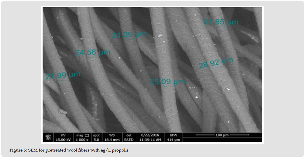 Wool fibres were pad-dried-cured. The wool fibres were treated with liquid propolis (2–10%), padded to 100% wet pick up, dried for 5 minutes at 80 ºC, and then cured for 3 minutes at 120 ºC.10 SEM, or scanning electron microscopy: Investigating the surface morphology of both treated and untreated wool fibres was done using a JSMT-20 scanning electron microscope (JEOL-Japan). Prior to inspection, the surface of the wool fibres was prepared on a suitable disc and sprayed randomly with gold. SEM work was done at Egypt’s National Research Centre.
