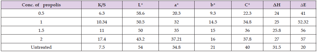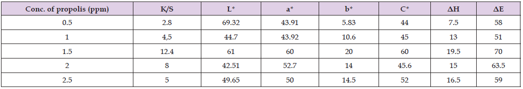 We assessed the effects of various propolis concentrations (0.5,1,1.5, 2 and 2.5ppm) on wool fibers that had been pretreated with propolis and dyed with curcumin natural dye. The outcomes demonstrated that, when wool fibres were dyed with curcumin dyes and pretreated with propolis, the 2-ppm concentration of propolis produced the highest value of K/S. This was assessed using the ultrasonic method, as presented in Table 1.