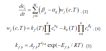 Where M, n –number of reactions and components of the mix, αij, βij - coefficients of direct and inverse reactions. Arrhenius low is predicted for calculating of speeds of changing of mix components concentration i c :