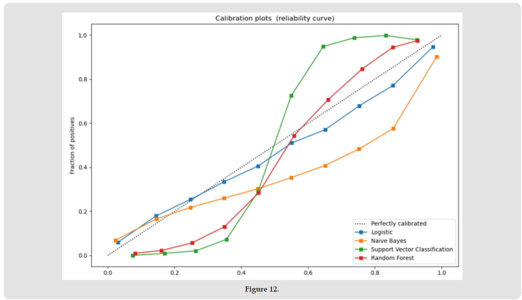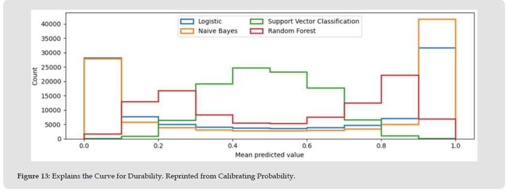 The calibration of probabilities is a classifier that generates class probabilities rather than class labels. It is often easier to know the likelihood of the forecast class in order to have some confidence in the predicted performance. That being said, not all classifiers endorse the output of probability and some of the bad outcomes in the output of probability are given. So, it is easier to calibrate before contrasting the classifiers, there is a specialized curve called the reliability curve that helps to decide which of the classifiers must be balanced. In the reliability curve, the classifier is well calibrated with a plot similar to the diagonal and conversely. It is important to calibrate classifiers that are way off the diagonal axis. Calibration are of two different type called Isotonic Regression and Platt Scaling used in probability calibration. These two approaches are meant for binary grouping and do not function for multi-class issues Moving multi - class challenges into binary categories is one way to use these approaches in multiclass problems [31]. Platt calibration is accomplished simply by moving the classifier into a special function called the sigmoid function, and isotonic calibration is done by moving the expected output or mapping the expected value by geometrically increasing the function (Figure 12). The reliability graph and mean expected value of various classifiers are seen in Figure 13 explains the Curve for Durability. Reprinted from Calibrating Probability. From the above reliability image, the curve of logistic regression is very similar to a diagonal line that is correctly tuned. This suggests that the logistic classifier does not need to be calibrated while the Support Vector Machine curve is skewed from the diagonal, which suggests that SVM offers very weak estimates of the estimated probabilities and requires to be calibrated.
