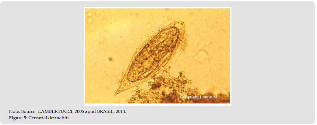 Acute Stage: After penetration, some of the larvae will die, while the rest will enter the venous circulation through the blood or lymphatic vessels. The cercariae present in the skin can trigger hypersensitivity reactions and pmaculopapular ruriginous, known as cercarial dermatitis (Figure 5) [16]. This condition is barely noticeable in people living in endemic areas and is most commonly observed only in primary infections. Symptoms include the formation of small blisters called phlyctenae and urticarial reactions. This is a delayed hypersensitivity cellular response characterized by the presence of lymphocytes, eosinophils and mononuclear cells, resulting in the death of approximately half of the cercariae that penetrate the skin [17]. After the cercariae have settled and the schistosomula have matured, the infection can progress to an acute symptomatic stage. Symptoms include eosinophilia, leukocytosis, generalized lymphadenopathy, and pulmonary infiltrates. The response to schistosomula is a continuation of the immune response triggered by cercariae. Stimulation of both the innate and acquired responses is observed, with a strong polarization toward the Th1 (T helper 1 cell) response [18].