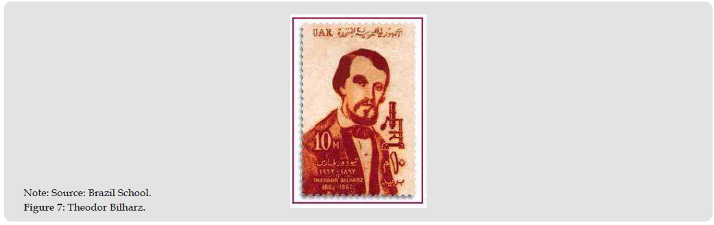 The disease was identified by German pathologist Theodore Bilharz in 1851 (Figure 7), in Egypt, during an autopsy on a young man. During the examination, a long white helminth was discovered in the blood from the vein. In addition, eggs with a terminal spike were observed, which were found in the feces and urine. Bilharz also noticed that the helminths had two suckers, which he assumed were mouths, and named them Distomun haematobium, “Distomun” meaning “two mouths”. In 1858, zoologist David Weinland and scientist Thomas Spancer, while studying the species, noticed that it had only one sucker in the oral cavity. They then suggested the name Schistosoma (split body to the male), because the female adheres to the male, which is larger [10]. Schistosomiasis was brought to Brazil by African slaves who disembarked at the ports of Recife and Salvador during the colonial period. These slaves, many of whom worked in the sugarcane fields, were the initial carriers of the disease. Its spread began in northeastern Brazil, establishing an area of transmission among the states of Rio Grande do Norte and Bahia [3]. The disease found favorable conditions for its development, including poor sanitation, abundant presence of streams, lakes, dams and exposed population. In the 18th century, with the decline of sugar production in the northeast region and the emergence of the diamond and gold economic cycle in Minas Gerais, a migratory movement brought the endemic disease to this new area [3-9].
