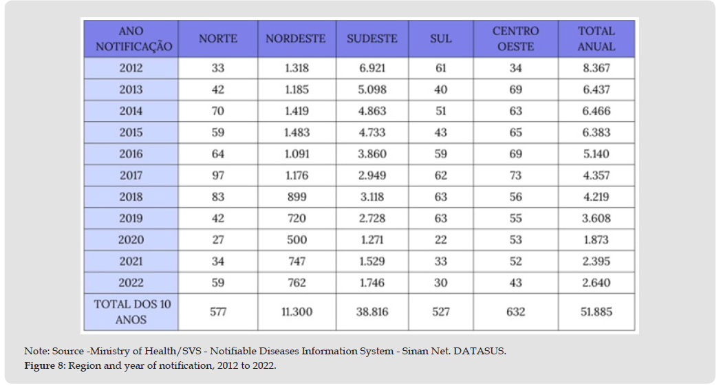 This is a descriptive epidemiological study with data obtained through query the DATASUS database. The time frame applied was ten years, with cases reported by region, age group and symptoms being accepted. The collected data were organized into tables and graphs in the Excel program to better organization and visualization of data.