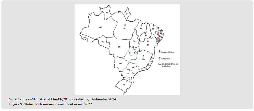 The spread of the disease spread widely throughout the national territory due to population movements, covering the five regions of the country (South, North, Southeast, Northeast and Central-West). It was particularly concentrated in nine states, with two in the Southeast (Minas Gerais and Espírito Santo) and seven in the Northeast (Pernambuco, Sergipe, Alagoas, Bahia, Paraíba, Maranhão and Rio Grande do Norte), identified as endemic areas. The spread of schistosomiasis is a complex and comprehensive issue, influenced by an interaction of biological, environmental, socioeconomic and behavioral factors. Therefore, this disease represents a considerable challenge to public health [11].