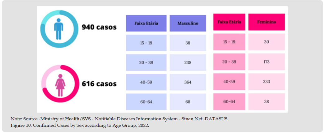 However, schistosomiasis is detected in 19 states, divided between endemic and focal areas. In Figure 9, the red dots indicate the endemic areas, where the disease is prevalent, such as Alagoas, Bahia, Pernambuco, Rio Grande do Norte, Paraíba, Sergipe, Espirito Santo and Minas Gerais, this is due to climatic and rainfall factors, especially at the end of the rainy season [24]. While the blue dots are the focal areas, such as Maranhão, Pará, Ceará, Piauí, São Paulo, Rio de Janeiro, Paraná, Santa Catarina, Rio Grande do Sul, Goiás and Distrito Federal, focal transmission does not extend over large areas, as occurs with endemic areas. Furthermore, the states in the Northeast and Southeast regions are areas with greater flows of tourists and immigrants in Brazil, especially in coastal cities. It is of great It is important to emphasize that visitors are exposed to infection by S. mansoni in these areas, contributing to the spread of the disease throughout the country and continents [25]. Based on the social variables analyzed, in Figure 10, that infection by Schistosomiasis is higher in men with 940 cases, than in women with 616 cases, in the year 2022.It was also observed that the most affected age group was between 20 and 59 years old for both genders. In the case of men, 238 cases were recorded between 20 and 39 years old and 364 cases between 40 and 59 years old. As for women, 173 cases were recorded between the ages of 20 and 39 and 233 cases were recorded between the ages of 40 and 59.