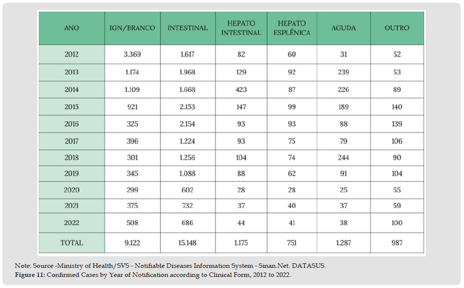 This is because men are more exposed, whether through occupational and leisure activities such as fishing, free swimming in lakes and rivers, as well as work such as agriculture, aquaculture, among others. The majority of cases reported among women are due to the way of life in which they live, most of these women live in communities where basic sanitation is precarious [25]. The PCE, despite adopting actions, did not control the disease in these regions over time, thus, transmission was maintained [26]. The assessment of schistosomiasis comorbidities is essential to expand knowledge about the clinical aspects and epidemiological profile of the disease. Observing Figure 11, we can highlight that the most common clinical form in the last ten years, with 15,148 cases, is the intestinal form. This form is the most frequent aspect of the disease and can cause discomfort such as gastritis, abdominal pain and the presence of blood in the stool [27]. The second most common form is the acute phase, with 1,287 cases, which causes fever, headache, chills and myalgia [27,28]. This phase can lead to complications such as hepato-intestinal, with 1,175 cases, and hepatosplenic, with 751 cases, which involve enlargement of the liver and of the spleen, which can lead to complications such as portal hypertension, associated with a high parasitic load and an intense immune response [28].