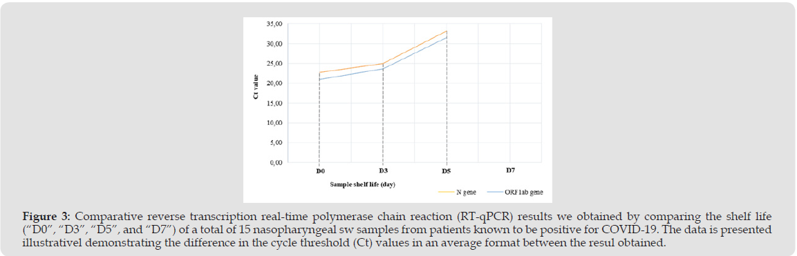 Table 2: Comparative reverse transcription real-time polymerase chain reaction (RT-qPCR) results were obtained by comparing the shelf life (“D0”, “D3”, “D5”, and “D7”) of a total of 15 nasopharyngeal swab samples from patients known to be positive for COVID-19. The data are presented as the mean ± standard deviation (SD) of cycle threshold (Ct) values for the ORF1ab and N genes of severe acute respiratory syndrome coronavirus 2 (SARS-CoV-2), along with the p-value for the comparison of the average results obtained.