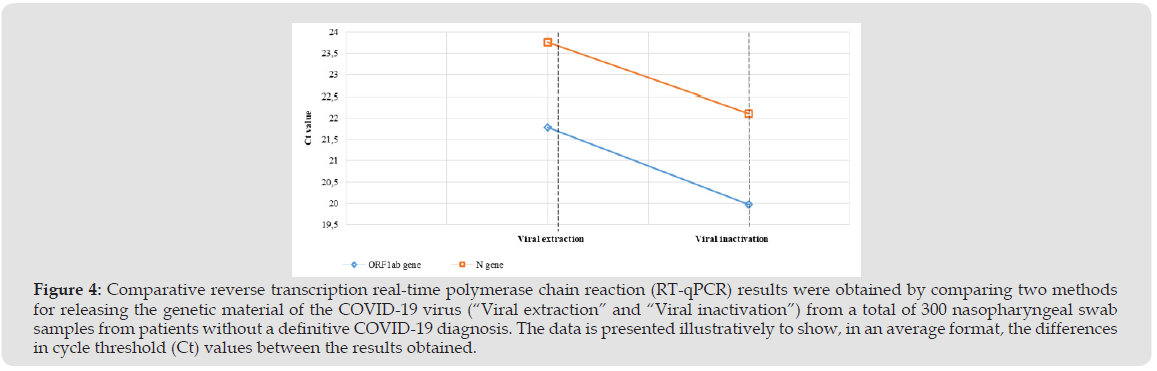 Table 3: Comparative reverse transcription real-time polymerase chain reaction (RT-qPCR) results were obtained by comparing two processes for releasing the genetic material of the COVID-19 virus (“Viral extraction” and “Viral inactivation”) from a total of 300 nasopharyngeal swab samples from patients without a definitive COVID-19 diagnosis. The data are presented as mean ± standard deviation (SD) of cycle threshold (Ct) values for the ORF1ab and N genes of severe acute respiratory syndrome coronavirus 2 (SARS-CoV-2), along with the p-value for the comparison of the average results obtained.