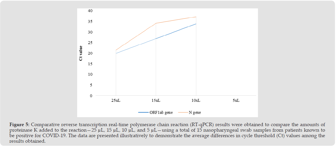 Step 4 (Assessing the Optimal Amount of Proteinase K): After validating the inactivation process, in experiment No. 4, we determined the optimal volume of Proteinase K to add to the samples. This approach aims to minimize costs and prevent unnecessary enzyme waste. Four aliquots of nasopharyngeal swab samples were collected from 15 patients confirmed positive for COVID-19. All aliquots were frozen (~-18 °C) for 30 minutes upon arrival at the Local Laboratory. In the first aliquot, 25 μL of Proteinase K was added; in the second, 15 μL; in the third, 10 μL; and in the fourth, 5 μL. After enzyme addition, all aliquots were subjected to 95 °C for 15 minutes in a Dry Water Bath NT 362 – DryBlo.