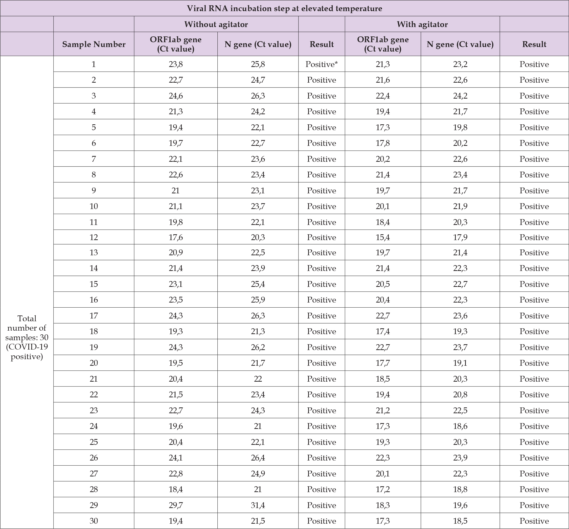 Supplementary Table 6: The cycle threshold (Ct) results for the amplification of the ORF1ab and N genes of the SARS-CoV-2 virus were analyzed in a total of 30 (thirty) nasopharyngeal swab samples from patients known to be positive for COVID-19, comparing the viral RNA incubation step at elevated temperature (“Without agitator” and “With agitator”).