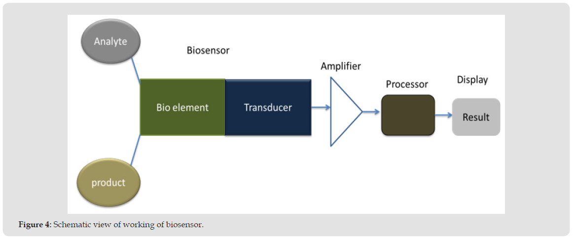 Working of Biosensors: Typically, the electrical signal that generated by the transducer is not very strong, and it is possible that it will be obscured by a high baseline. In order to improve the clarity of the signal, signal processing frequently entails removing a baseline signal that taken from a transducer that did not have any biocatalyst coating on. Signal refinement facilitated by the comparatively slow response of biosensor reactions, which makes the filtering of electrical noise easier to do. In spite of the fact that the direct output is still in its analog form at this stage, it converted into digital form before sent to the microprocessor phase [61]. In this stage, it subjected to additional processing, which include amplification, conversion to units, and storing in a specific data repository? The process of digitization and processing ensures that the data are correct and can be interpreted, which makes it easier to analyze, interpret, and use biosensor results in a variety of applications [62,63].