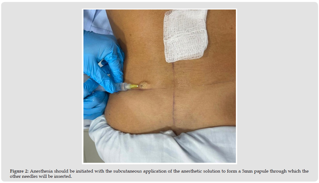 With the patient in the prone position, antisepsis of the lumbar region and hip is performed, followed by the placement of sterile drapes. The posterosuperior iliac spine (PSIS) is identified by ultrasonography, using a convex transducer to define the anatomical target. A local anesthetic is used to numb the skin and periosteum at the site of marrow collection. Lidocaine or another local anesthetic may be used if the patient has no history of adverse reactions to the drug. Complete local anesthesia, which avoids discomfort during the procedure, is ensured by waiting for adequate time after administration (Figure 1). The anesthetic used is usually prepared using 5 mL of sterile 2% lidocaine hydrochloride with 4 mL of normal saline and 1 mL of sterile 8.4% sodium bicarbonate solution (1 mEq/mL) in a 10 mL plastic syringe fitted with a 1-1/2-inch 22-gauge needle. Packing lidocaine with sodium bicarbonate improves pain perception from local anesthesia, which is usually caused by the acidity of lidocaine. This solution is applied intradermally, forming a small 5mm papule, through which the larger needles will be inserted to anesthetize the subsequent anatomical planes until it reaches the surface of the periosteum (Figure 2). After ultrasound identification of the PSIS, the needle is guided to the periosteum, where anesthetic infiltration with 1% lidocaine is performed for periosteal hydro dissection.