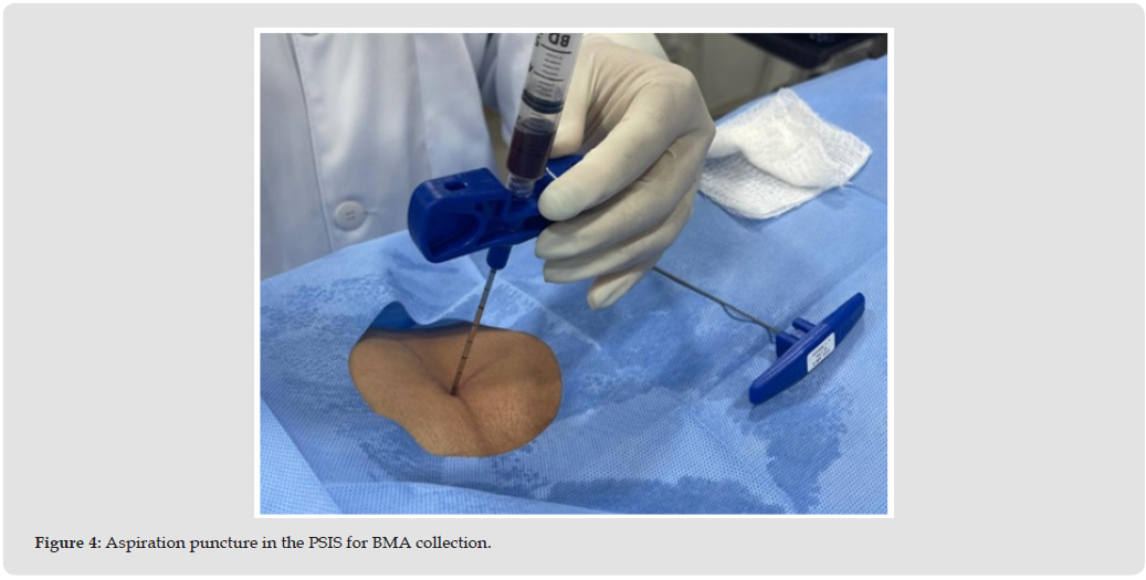 In the field of regenerative medicine, orthobiologicals play a vital role. These biological products, obtained from autologous or allogeneic sources, are used to promote the repair and regeneration of musculoskeletal tissues. Peripheral blood products such as platelet- rich plasma (PRP), platelet-rich fibrin (PRF), and plasma power mix (PPM) have shown significant efficacy in tissue healing and regeneration, with a number of studies and meta-analyses validating the technique for a range of pathologies [2,5,7,15,17,19,20,23,30]. However, the need for a biological safety center for the processing of PRP without risks of contamination and the lack of standardization in the processing of this biological is an inexhaustible source of criticism and prevents the technique from being easily replicated in many clinics around the world [31-34] (Figure 4). Among bone marrow derivatives, bone marrow aspirate (BMA) and bone marrow aspirate concentrate (BMAC) are particularly important. BMA consists of collecting progenitor cells and growth factors directly from the bone marrow, whereas BMAC is an enriched version of BMA, with a higher density of mesenchymal stem cells and other bioactive components. [17-21] Bone marrow aspirate (BMA) collection has been consolidated as an essential technique in regenerative medicine, particularly in the application of orthobiologicals for the treatment of musculoskeletal diseases [22].