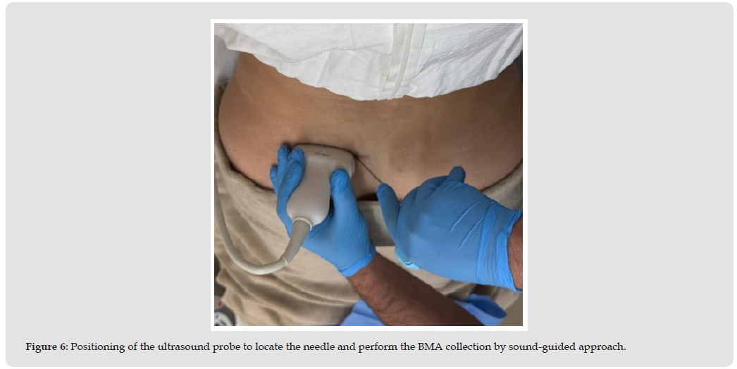 The anesthetic onset time (usually 10 minutes) is respected before puncture.After the waiting time for latency of the anesthetic a small incision can be made with a scalpel blade at 11 or the Jamshidi needle can be introduced directly Under Direct Sonovisualization of the PSIS, to confirm the parallelism between the needle and the iliac, the Jamshidi needle is then advanced with constant pressure and a slight twisting motion through the anesthetized skin and subcutaneous tissue to the posteromedial aspect of the posterior iliac crest. At this point, the patient should be asked about pain to assess whether there is a need for anesthetic supplementation. If there are no complaints from the patient, the needle should be gently advanced through the cortical bone by rotation and constant pressure. A feeling of decreased resistance usually indicates penetration of the cortex and needle entry into the cancellous bone. This causes an uncomfortable or even painful sensation in some patients. The needle should be advanced about 1 cm into the cancellous bone of the spinal cord. BMA collection is performed using a sonoguided posterolateral approach and with a Jamshidi needle parallel to the iliac cortical, using 10 mL syringes to aspirate 5 mL at a time. After each aspiration, the needle is progressively advanced along the iliac crest, until it reaches the desired volume (Figure 3).