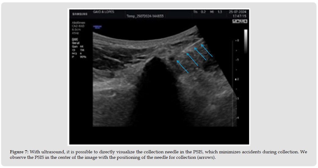 The sonoguided procedure tends to be less painful due to the precision of the puncture, resulting in less tissue trauma. Because it is a less invasive method, the post-procedure recovery time is usually shorter. Ultrasound visualization allows healthcare professionals to perform the procedure with more confidence and fewer attempts, increasing the overall efficiency of the collection [28,29,42-44] (Figure 7). Sonoguided collection of spinal cord aspirate in the posterosuperior iliac spine not only increases the success rate of the procedure but also provides greater comfort and safety to the patient. Ultrasound technology, with its ability to provide real-time images, revolutionizes the approach to these procedures, offering a modern and effective alternative that is confluent with the minimally invasive approaches used in the practice of regenerative medicine.