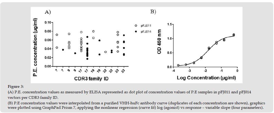 Expression levels of different CDR3 clones identified in both pFJ011 and pFJ014 were compared as periplasmic extracts by ELISA. Wells of maxisorp plates (NUNC) were coated with 5 μg/ml of goat anti-human IgG-Fc specific (JIR, Cat#109-005-098) overnight at 4°C. After blocking in 4% skimmed milk, periplasmic extracts (1:5) were incubated for 1h at RT and detected with anti-HIS-HRP (Miltenyi Biotec, Cat#130-092-783) 1:1000 dilution. TMB(eBioscience) was used for development and reaction stopped with H2SO4. A titration curve (3-fold serial dilution ranging from 0.6-0.0002 μg/ml) of a purified VHH-huFc antibody was used to determine the concentration of VHH huFc periplasmic extract (P.E.) in each samples.