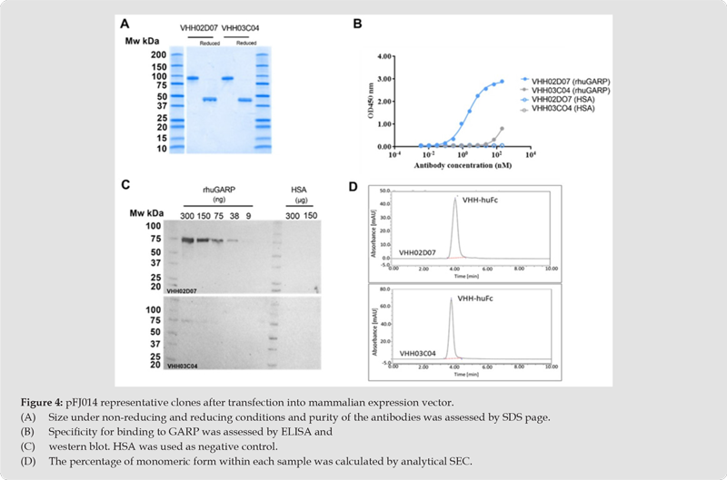 VHH clones derived from the pFJ014 vector could be produced as full-length Fc fusions after transient transfection into a ExpiCHO S cells, a robust mammalian expression system to produce antibodies [23]. All antibodies were purified via Protein A affinity chromatography with a yield range of 200-1000mg/L for all VHH-Fc fusions. Next, purity and integrity of the purified proteins was assessed by SDS PAGE and analytical size exclusion chromatography (SEC). On SDS PAGE, the selected clones showed a single band with an expected molecular mass of 82 kDa as expected. Analytical SEC demonstrated monomeric percentage of Fc fusions higher than 92 %. Binding of the clones to huGARP was confirmed by ELISA and western blot (Figure 4) to assess the capacity of VHH-humanFc constructs to bind properly folded and denatured recombinant human GARP, respectively. Taken together, the VHH Fc fusions in pFJ014 vector could be produced to high yields, purified using a straightforward classical strategy, without affecting the target binding characteristics.