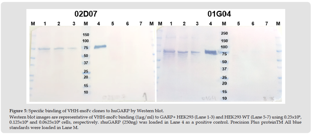 Western blot analysis was based on methods described before [19-22] with modifications for detection of periplasmic extracts or purified VHH Fc fusions. Shortly, recombinant huGARP (R&D systems) or huSA (Sigma) were run on SDS PAGE gel under reducing conditions, blotted on PVDF membrane and blocked in 4% skimmed milk. Blocked membranes were incubated with purified polyclonal phage (1:1000 dilution), crude periplasmic extracts (1:50 dilution) from the different rounds of phage display selections, or with purified VHH huFc (2.5 μg/ml) or VHH moFc fusions (1μg/ml) for 1 h at RT. Phages were detected with anti-M13 (GE Healthcare, Cat# 27- 9421-01) 1:5000, periplasmic extracts and VHH huFc with goat anti- human IgG, Fcɣ Fragment Specific (JIR, Cat# 109-035-098) 1:5000 and VHH moFc with donkey anti-mouse IgG (H+L) (JIR, Cat#715-035- 150) 1:20000. All detection Abs were HRP conjugated diluted in 1 % skimmed milk and incubated for 1h at RT. Staining was established using the colorimetric HRP substrate TMB (Sigma). Finally, total cell lysates of GARP transfected versus parental HEK293Ecells (0.25 0.125 0.062 X106 cells) were loaded on gel, incubated with 1 μg/ml purified monoclonal VHH moFc and detected with HRP anti-mouse Ab as described above.