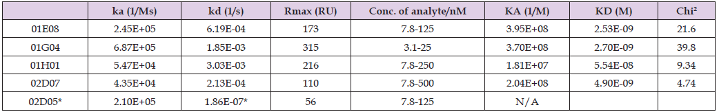 Table 2: Summary of kinetic parameters estimated based on the Langmuir 1:1 binding model for lead monoclonal VHH-moFc antibodies to immobilized huGARP by SPR.