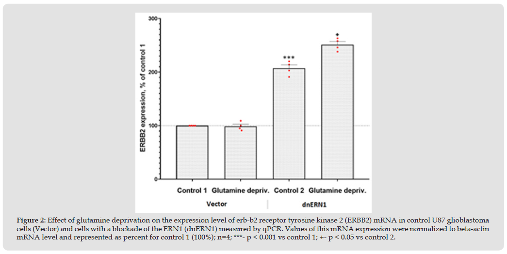 To investigate a possible role of endoplasmic reticulum stress response in the control of EGFR, ERBB2, TOB1, and CEBPB gene expressions in U87MG glioblastoma cells under low glutamine conditions we studied the impact of glutamine deprivation on the expression of these genes in control glioblastoma cells (transfected by empty vector) and cells with ERN1 knockdown. As shown in Figure 1, the expression of EGFR mRNA does not significantly change in control glioblastoma cells after exposure to glutamine deprivation in comparison with the cells growing in a complete DMEM medium. However, inhibition of enzymatic activity of ERN1 signalling protein by dnERN1 is enhanced the sensitivity of EGFR gene expression to this experimental condition. Thus, the level of this mRNA expression is increased by 27 % (p < 0.05) in cells without the enzymatic activities of the ERN1 signalling protein (Figure 1). Next, we investigated the effect of glutamine deprivation on the expression of gene encoding ERBB2 with inhibition of ERN1 function. As shown in Figure 2, the expression of this gene is resistant to glutamine deprivation resulting in control glioblastoma cells in comparison with no treated cells (control 1). At the same time, ERN1 knockdown also increases the sensitivity of ERBB2 gene expression to glutamine deficiency (+21 %; Figure 2). We also investigated the effect of glutamine deprivation condition on the expression of TOB1 (transducer of ERBB2, 1) gene in U87MG glioblastoma cells with ERN1 knockdown.