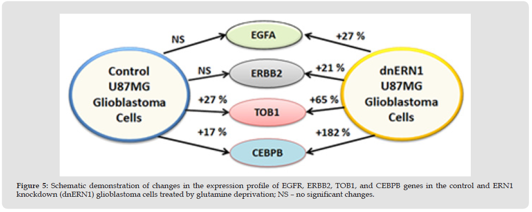 In this work, we studied the effect of glutamine deprivation on the expression of EGFR, ERBB2, TOB1, and CEBPB genes encoding important tumour-related factors in glioblastoma cells with the inhibition of ERN1, the major signalling pathway of the unfolded protein response. The results of our study clarify the possible mechanism of changed sensitivity to glutamine deficiency of the expression of genes encoding important factors associated with tumour growth in ERN1 knockdown glioblastoma cells [11-13]. Thus, our results indicated that ERN1, a major signalling pathway of unfolded protein response, controls the sensitivity of all studied genes to glutamine supply in glioblastoma cells in a gene-specific manner and that the lower sensitivity of the expression of EGFR, ERBB2, TOB1, and CEBPB genes in control glioblastoma cells to glutamine deficiency is due to stress-mediated polyresistance, in particular its ERN1 signalling pathway [13,29]. Results of this study summarized in Figure 5, clearly demonstrate the differential effect of decreased glutamine level on the expression of EGFR, ERBB2, TOB1, and CEBPB genes and ERN1-dependent character of changes in their expression profile in glioblastoma cells under glutamine deficiency in a gene-specific manner. These results are consistent with previously obtained data on ERN1-mediated dependence of many other gene expressions on glutamine deficiency [10-13]. Furthermore, we showed that the expression of tumour suppressor TOB1 and especially multi-functional transcription factor CEBPB has increased sensitivity to glutamine deficiency in glioblastoma cells with inhibited enzymatic activities of ERN1 compared to control cells (Figure 5).