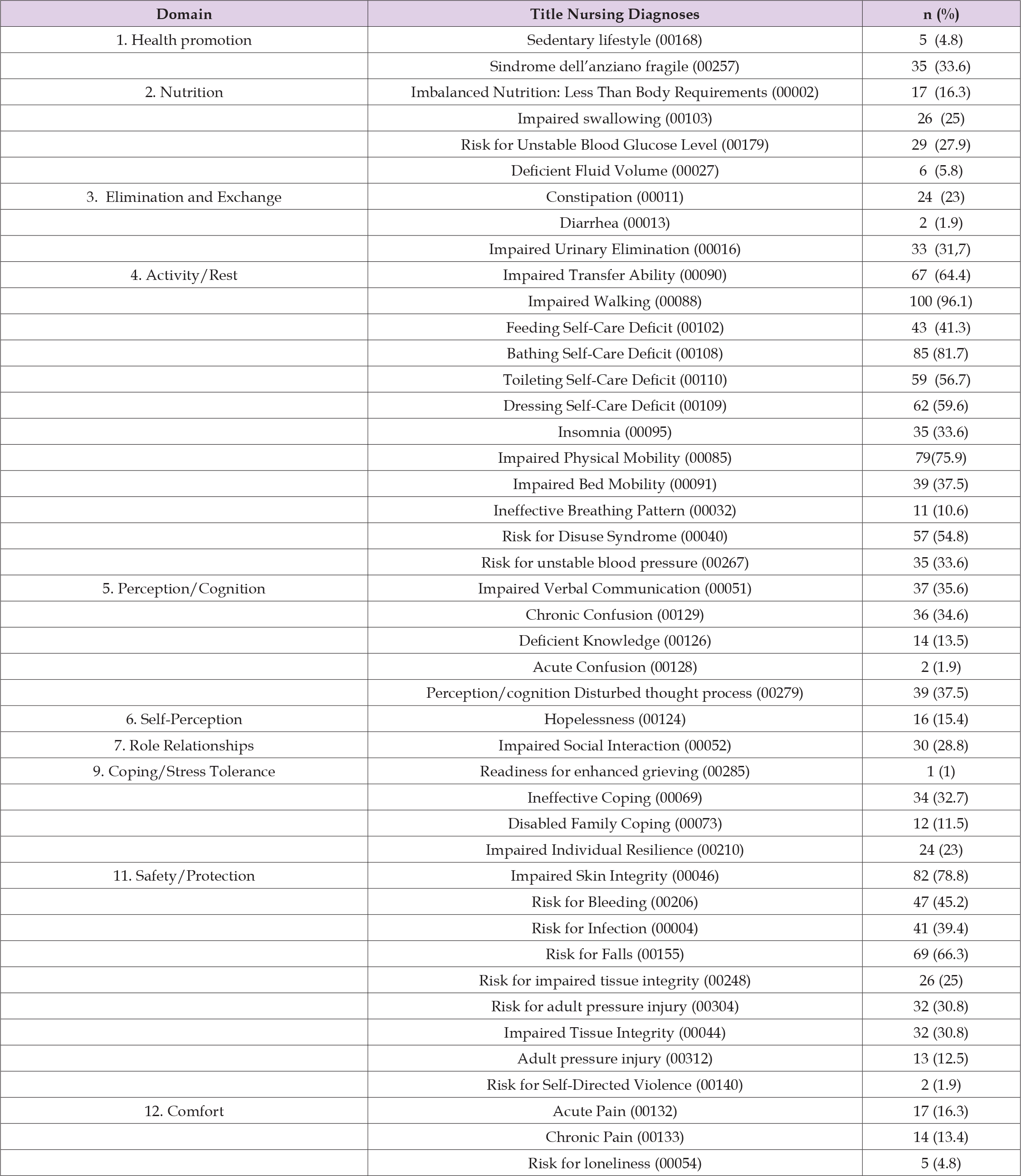 104 medical records that met the inclusion criteria were analyzed. The median age of the patients was 86 years, with a range of 43-104 years with a prevalence of the female gender (63%). The activation of the home care service occurred in three-quarters of the cases on the initiative of the General Practitioner, and in 23% following discharge from hospitalization. The reasons for activating hmanagement, nutrition and metabolism, and activity and exercise were found to be dysfunctional in more than 90% of the patients, while the cognitive-perceptual model was dysfunctional in 70%of the cases (Table 1) There were 42 nursing diagnosis titles identified (Table 2). The most frequent are: Impaired Walking (96.1%), Bathing Self-Care Deficit (81.7%), Impaired Skin Integrity (78.8%), Impaired Physical Mobility (75.9%), Risk for Falls (66.3%), Impaired Transfer Ability (64.4%) and Dressing Self-Care Deficit (59.6%).