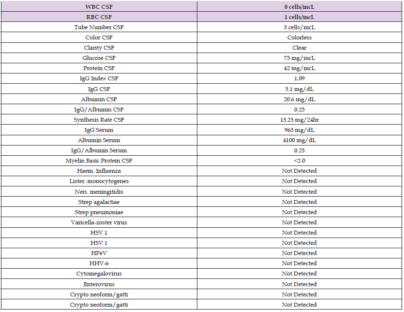 Her husband is contacted and provides additional information, reporting that since leaving the inpatient psychiatric facility, she has been hallucinating daily, barely sleeping and eating, threatening to kill him, and refusing medications. The patient’s diagnosis is changed to acute psychosis. There are no obvious organic causes at this time. She is started on Abilify 2mg twice daily and Haldol 5mg every four hours as needed for agitation. She is then admitted for inpatient behavioral health care. Day 26, the patient has been receiving inpatient psychiatric treatment for the past two weeks. Upon reevaluation, her rapid cognitive decline and psychosis is yet to be explained. She is diagnosed with schizophreniform disorder and considered for further neuroimaging. Day 30, neuroimaging, including brain MRI and EEG, are unremarkable. She is intermittently ataxic, has fluctuating orientation, and continued paranoid delusions. Neurology is consulted and an autoimmune encephalopathy panel is pending. Day 31, the patient is now exhibiting manic symptoms of euphoria and decreased need for sleep. She is responding to internal stimuli, has myoclonic twitching and stereotypical movements. She is having both auditory and visual hallucinations. Lumbar puncture is pending. Day 32, the patient has proved to be treatment resistant on maximum doses of antipsychotic therapy and continues to be delusional with visual hallucinations and paranoia. CT of abdomen, pelvis, thorax and lumbar puncture were unremarkable. The patient left the inpatient psychiatric unit against medical advice to go back home with her family. Day 36, additional CSF results returned positive for 13 oligoclonal bands not found in the serum (Table 1). In addition, CSF IgG index and synthesis rate were both elevated at 1.09 and 13.23 respectively (Table 2). VDRL, cryptococcal antigen, and antibodies to Borrelia burgdorferi were negative. With these new lab findings, neurology was able to make a diagnosis of autoimmune encephalitis. Upon speaking with the patient’s family, she was seen by her primary care physician earlier in the day with continuing symptoms of agitation, paranoia and delusions. The patient’s family was then prompted to bring the patient back to the emergency department in order to be admitted and properly treated with high dose steroids and IVIG therapy.
