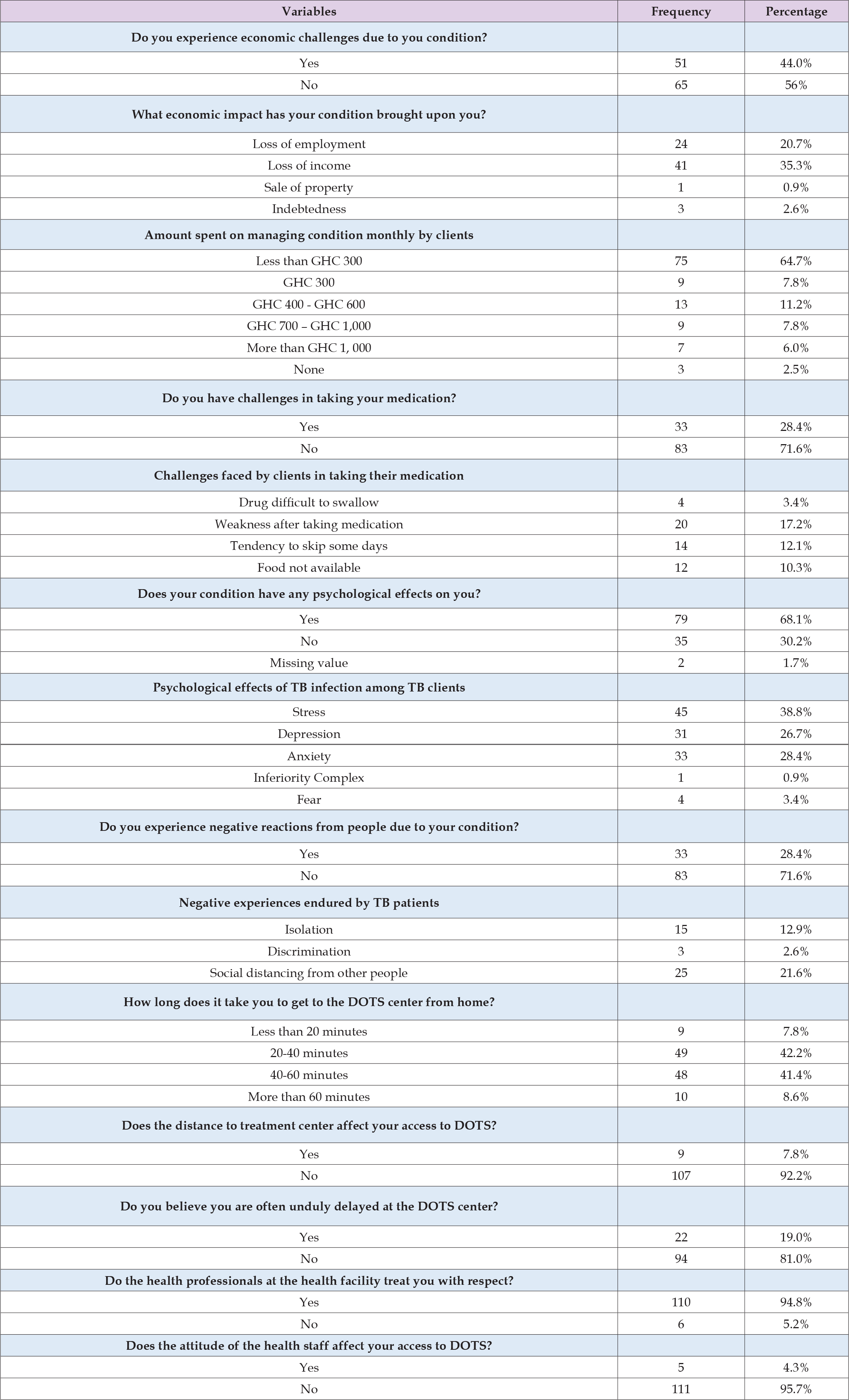 Table 2 shows the challenges Tuberculosis patients in the Adentan municipality faced. Most of the study participants 65(56.0%) said they were not facing any economic challenges when they were asked whether they faced any economic challenges while 51(44.0%) said they had economic challenges. Also, 41(35.3%) of respondents said they lost their incomes, 24(20.7%) said they lost their employment, 3(2.6%) said they were indebted, while 1(0.9%) sold properties to cater for needs. When asked about the amount the study participants spent in managing their condition on monthly bases, majority of the participants 75(64.7%) said they spent less than GHC300.00; 13 (11.2%) said they used between GHC 400 and GHC600.00; whiles few respondents 3(2.5%) said they were not spending any amount on their condition. Majority of TB patients 83(71.6%) said they had no challenges in taking their TB medication, whiles 33(28.4%) answered yes indicating they had challenges in taking their TB medication. With the kind of challenges faced by client in taken their medication, 20(17.2%) of participants said they felt weak after taking medication; 14(12.1%) said they had the tendency to forget their medication, 12(10.3%) mentioned food not been available; while few 4(3.4%) said taking more than one tablet of medicine every day for six months was a big challenge. In addition, the majority of the study participants 79(68.1%) stated that they had psychological effects after being diagnosed with TB; whiles 35(30.2%) said they did not experience any psychological problems after they were diagnosed TB. Furthermore, with the type of psychological effects the TB clients faced, most 45(38.8%) mention stress,33(28.4%) mentioned anxiety, 31(26.7%) mentioned depression, 4(3.4%) mentioned fear while the least 1 mentioned inferiority complex. Majority 83(71.9%) of the responded said they had no negative reaction from people due to TB; whiles 33(28.4%) said they experienced negative reactions from people due to TB disease.