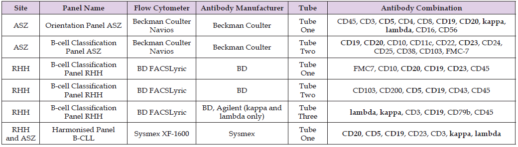 Table 1: Antibody combinations and manufacturers used locally at ASZ and RHH. Recommended B-CLL Antibodies are shown in bold.