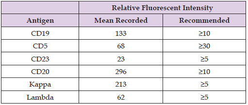 Assessment of five normal samples demonstrated that the required antibodies all exceeded the relative fluorescent intensities necessary for the detection of B-CLL [9], see Table 2.