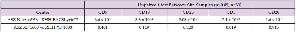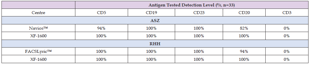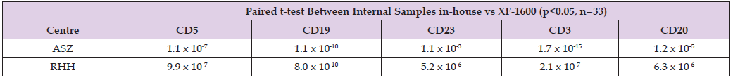Cloning of the XF-1600 Panels and Settings Across Laboratories: The B-CLL panel and settings were created on the reference XF- 1600 instrument at RHH. This included a standard setup of a panel encompassing gain settings, titration of antibodies, compensation, dot plots and gating strategy [9]. The cloning procedure was then applied to the reference instrument. A medium fluorescent rainbow bead (CyFlow GainSet, Sysmex, Kobe, Japan) was acquired on the XF- 1600 using the B-CLL panel and all settings. The beads were then gated in an FSC v SSC log scale dot plot and the gate was applied to histograms for each fluorescent channel. A tight region was then placed to cover the peak observed in each channel and saved. The B-CLL panel and settings, along with the cloning information were sent to AZH for upload onto their device. Using the same lot number of CyFlow Gain- Set, AZH altered the gains in the panel to place the peaks into the gate in each channel of the template. This information was saved and applied to the B-CLL panel and intra-laboratory cloning was complete. The B-CLL samples identified at each site were then tested locally on the laboratory’s harmonised XF-1600 flow cytometer using the harmonised staining protocol described earlier to detect the presence/ absence of cell surface antigens. Each sample was acquired using the XF-1600 acquisition software, version 5.0. The data was then analysed using VenturiOne software V7.5.