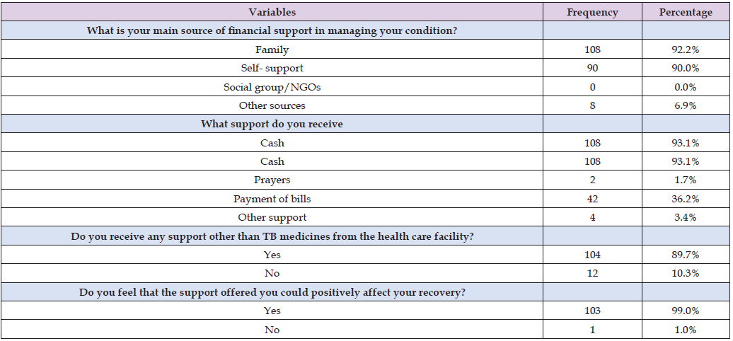 A critical aspect of TB management is the role of healthcare facilities in providing comprehensive care beyond medication. When participants were asked whether they received additional support from healthcare facilities, 104 respondents (89.7%) affirmed that they did, while 12 (10.3%) said they did not. This finding indicates that many healthcare facilities in the Adentan municipality are making efforts to extend their services to meet the broader needs of TB patients. However, the fact that over 10% of respondents reported receiving no additional support suggests that gaps remain in the system, particularly in ensuring equitable access to auxiliary care services.