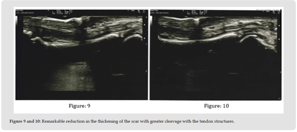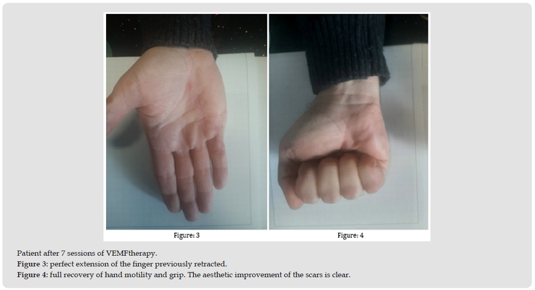 This study was developed by combining retrospective experiences of the various authors who casually found to have had similar outcomes on patients treated for scars on the palm of the hands, also burdened by Dupuytren’s contracture, and who then retrieve all the documentation provided in this study. The fortuitousness of this discovery hindered the preparation of a study plan with certain parameters for patient enrollment, such as patient splitting into homogeneous groups in order to compare results with greater precision; however, the authors have decided to stick to those parameters in order to recruit a significant number of patients to see if the results obtained will be confirmed on a large scale. The analysis of the collected data is positive and potentially preferable to existing state-of-the-art therapies, at least for the first six months. If on the one hand more sessions are required (in our case we have provided between 3 and 7), on the other the immediate recovery of full activity by the patients, absence of pain, downtime or restrictions to regular lifestyles as well as greater relaxation of the fingers were appreciated already from the first session. A clear improvement of the pathology with total stabilization over six months was proven by all the assessment scales adopted; this makes us optimistic in view of a larger clinical study. The total absence of side effects, already demonstrated by VEMFtherapy in scars treatment [39,43-46] was also appreciated. Analysis of the existing literature suggests that the combined action between electromagnetic fields and negative pressure has an important effect on the remission of fibrosis [39,43] as has also been shown by the separate use of electromagnetic fields, although in different fields [36-38] and negative pressure, which mechanical action promotes a series of reactions in terms of mechanotransduction [21,22,44,45] by converting mechanical stimuli into biochemical signals that activate a series of cascade reactions, reducing the compactness and strength of the fibrous component. In our opinion, the anti-inflammatory action of the electromagnetic fields is particularly relevant, as these lead to an increase in the production of IL-10 anti-inflammatory cytokines 46, analogously to what has been documented with negative pressure [28] (Figures 6-10).