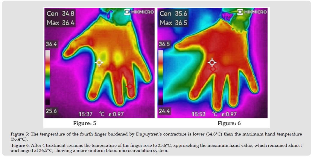 All patients responded positively to the therapy, showing an increased extension of the treated fingers and a softer and more elastic tissue from the very first treatment application. The echographies showed a reduction in the thickening of the scar and its fibrosis combined with an increased cleaving of the tendon structures. The infrared camera detected a significant difference between the maximum temperature of the fingers (36.4 °C) and the retracted finger, which average temperature was 34.8 °C before therapy. After the treatment cycle, the maximum temperature of the hand was stable (36.5 °C) while that of the suffering finger increased to 35.6 °C, demonstrating a more uniform vascularization of tissues. DASH assessment score provided crucial information on functional recovery of the fingers/hands, as before the treatment the average level was 37.33 (from 32.50 to 42.75) while after the cycle of sessions it reduced to an average value of 11.66 (from 6.50 to 16.75), with a significant average improvement of 25.67 (equal to 68.77%).The average comfort level was 7.71 (from 7 to 9), showing that the patients considered the treatment pleasant and relaxing. VAS scale before the treatment cycle showed an average level of pain of 3.01 (from 2.1 to 3.5), after therapy it lowered to an average value of 1.07 (from 0 to 1.8) showing a significant average improvement (-1.94 equal to -64.5%). The follow-ups performed six months later showed a slight improvement of the VAS scale (average value 0.88, minimum 0, maximum 1.5) and stabilization of the DASH score. No subject experienced side effects, not even minor ones, during the treatments and all of them could immediately resume their normal lifestyles without any restrictions.