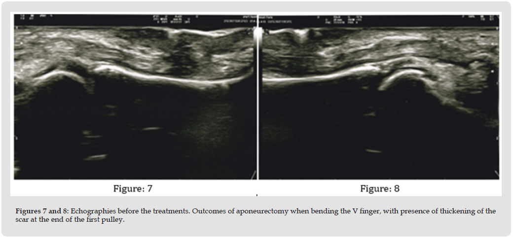 Biodermogenesi®, otherwise called VEMF therapy, is based on the simultaneous delivery of electromagnetic fields with frequency ranging from 0.5 to 2 MHz, power between 0.4 and 0.6 W, negative pressure with a value between -10 and -15 cents of BAR and square-wave electrostimulation at 5 Hz with intensity of 3.5 VPP. In the specific application, it is recalled how electromagnetic fields have shown particular effectiveness in treating fibrosis [36-38], and in particular how VEMFtherapy has restored motility limited by significantly extended and thick fibrosis [39].The outcomes of the study are documented by echographies, performed with different instruments at patient’s trusted ultrasound technician’s and with a PocketE_Hikmicro infrared camera (Hangzhou Microimage Software Co., Ltd., Hangzhou, Zhejiang, China) intended to detect the temperature of the hand in question. These instrumental tests were combined with the evaluation of hand functions by adopting The Disability of the Arm, Shoulder, and Hand (DASH) questionnaire [40,41]; with the assessment of the level of comfort of patients verified on a scale from 0 (no comfort) to 10 (maximum comfort); and with the Visual Analog Scale (VAS) pain scale [42]. VAS and DASH evaluations were also performed 6 months after the end of the treatment cycle. This study was conducted in full compliance with the standards in the Declaration of Helsinki and MEDDEV 2.7.1 revision 4 on clinical research. The study was not submitted for prior approval by the Ethics Committee as patients underwent therapy of their post-surgical scars in order to reduce the aesthetic impact and fibrosis. These procedures are already widely documented by the technology under discussion [39,43-46]. The improvement of Dupuytren’s contracture was appreciated, especially by the patients, but it was not expected. The sharing of information between the authors led to the discovery of the uniformity of the results and thus to write this article.