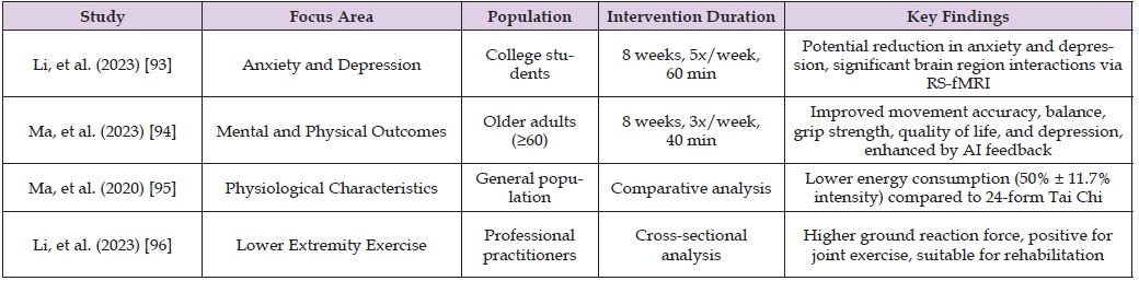 Studies on Mental Health Outcomes: One notable study is “The effect of Bafa Wubu of Tai Chi on college students’ anxiety and depression: A randomized, controlled pilot study” [93]. This pilot study aimed to explore the mechanism of Bafa Wubu’s effects on anxiety and depression using resting-state functional magnetic resonance imaging (RS-fMRI). Conducted with 18 college students (5 males, 13 females) aged 22.50 to 24.20 years, the experimental group received an eight-week intervention, practicing Bafa Wubu five times a week for 60 minutes per session. The control group maintained normal daily life without exercise. Assessments included RS-fMRI scans, the self-rating anxiety scale (SAS), and the self-rating depression scale (SDS), with statistical significance set at p < 0.05. Results suggested potential benefits for mental health, particularly in reducing anxiety and depression, with brain imaging showing significant interactions in certain regions. Another study, “The Effect of Tai Chi (Bafa Wubu) Training and Artificial Intelligence-Based Movement-Precision Feedback on the Mental and Physical Outcomes of Older Adults: A Randomized Controlled Trial” [94], compared the effects of AI-based feedback and standard training in a 4-week Tai Chi program for older adults. Participants, aged 60 and older, were divided into three groups: an AI feedback group, a conventional feedback group, and a control group, all undergoing an 8-week schedule with three sessions per week, each including a 5-minute warm-up, 30-minute Tai Chi practice, and 5-minute cool-down.