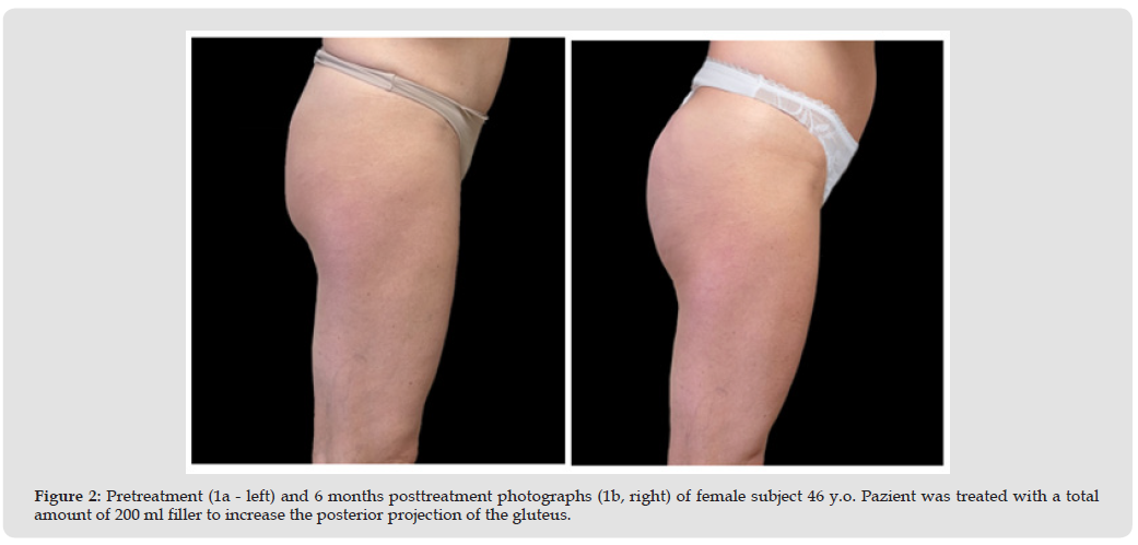Clinical data emerging from this study showed that the filler used is effective and safe to treat buttock area (Figures 1 & 2). The protocol used in this study proved to be valid, effective, safe and of good compliance by patients. After a month the study demonstrated therapeutic success, judged as sufficient, good or excellent, in all subjects who completed the entire protocol, demonstrating the effectiveness of buttock enhancement filler procedure. This study shows the safety of proposed procedure for buttock enhancement with HA volumizing filler: this is due to the filler characteristics (inherent safety) and to the employed technique (extrinsic safety/procedural safety). Filler’s characteristics are diriment for safety and effectiveness [9]. The chemical composition of body fillers used in past (high percentage of cross linking and high concentration of HA in addition to the type of hyaluronic acid used with very high molecular weight) has caused a high onset of adverse events, such as inflammatory and non-inflammatory nodules, edema, abscesses, systemic responses to infection. The reduction in the molecular weight of the HA used (<2,000,000 Daltons) and the concentration of the HA (20mg/ml) have drastically reduced the incidence of these adverse events, making body fillers safe at least as face fillers. The procedure is extremely important, and it is aimed at minimizing extrinsic risk.