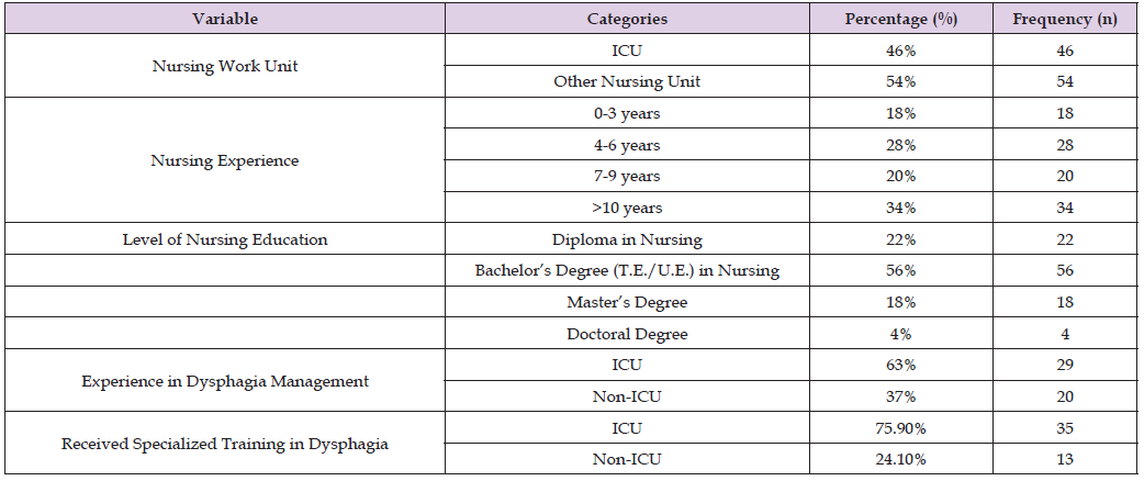 Despite the critical nature of their involvement, the specific responsibilities of nurses in dysphagia management remain inadequately defined, and there is a notable lack of standardized protocols guiding their practice. Furthermore, specialized training programs on dysphagia care for nurses are limited, resulting in variability in knowledge and clinical competency across different healthcare settings [6- 8]. Addressing this gap is essential to enhancing the effectiveness of dysphagia management, as well-trained nurses can play a pivotal role in implementing evidence-based feeding strategies, monitoring patients for changes in swallowing function, and providing education to both patients and caregivers on safe swallowing techniques.Studies have increasingly highlighted the multifaceted contributions of nurses in dysphagia management. Their responsibilities include conducting initial screenings to identify at-risk patients, assisting with bedside swallowing assessments, and collaborating closely with speech and language therapists to reinforce therapeutic recommendations. In addition, nurses are instrumental in adapting dietary modifications, supervising mealtime strategies, and advocating for patient-centered interventions that align with individual needs [9]. By enhancing their training and clarifying their role within the healthcare team, nurses can further optimize dysphagia care and improve patient outcomes. The purpose of this study is to investigate nurses’ knowledge regarding dysphagia, with particular emphasis on comparing the knowledge levels between nurses working in Intensive Care Units (ICUs) and those working in other clinical units. The research aims to assess the level of knowledge concerning the symptoms, complications, and management strategies of dysphagia, focusing on the effective care of affected patients.