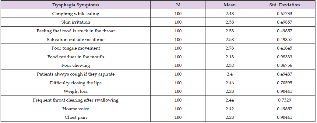 Knowledge on Dysphagia Symptoms and Signs: The second section aimed to evaluate the nurses’ knowledge of the indications, signs, and symptoms of dysphagia.