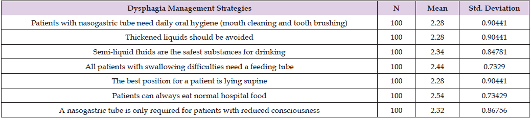 Feeding Management in Dysphagia: The fourth section focused on nurses’ knowledge about feeding management for dysphagia patients, covering topics such as appropriate interventions to prevent complications, safe feeding practices, and the implementation of therapeutic protocols.